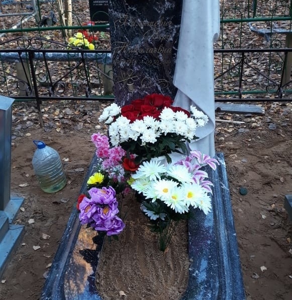 Фундамент сплошной бетонный, сверху обложен тротуарной плиткой. Надгробная гранитная плита 100-50, ваза гранит
